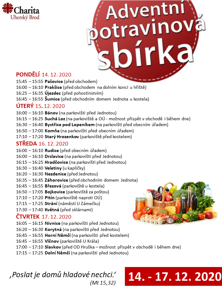 Tradiční Adventní sbírka se letos na Uherskobrodsku uskuteční ve dnech 14. až 17. prosince, a to celkem ve 26 obcích regionu.