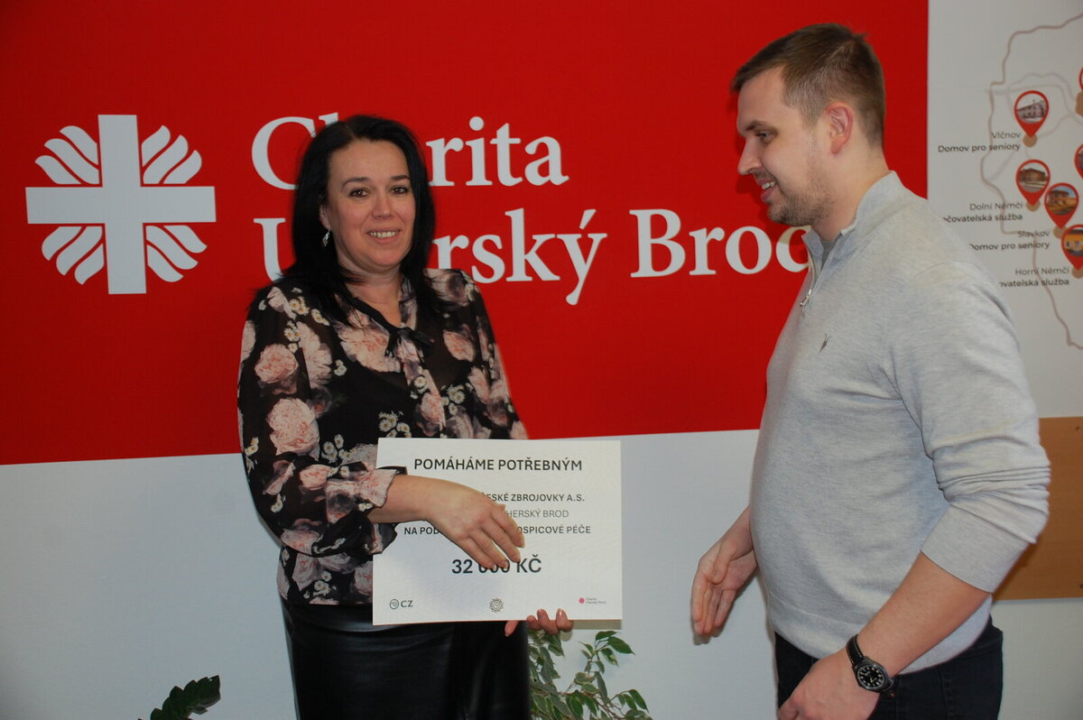 Dar byl Charitě Uherský Brod slavnostně předán zástupci České zbrojovky – personálním ředitelem Petrem Palečkem, asistentkou generálního ředitele Petrou Truxovou, a panem Normanem Gromanem, a to přímo ředitelce Charity, paní Miroslavě Havlíkové. Setkání bylo nejen příležitostí k předání finanční podpory, ale také k otevřenému dialogu o činnosti Charity a konkrétních formách pomoci, napříč celým regionem Uherskobrodska. Zástupci České zbrojovky se během návštěvy seznámili s každodenní prací a problémy pracovníků Charity Uherský Brod, jejich odborným i lidským přístupem a náročností služby, kterou Charita představuje. Právě osobní zkušenost a hlubší pochopení smyslu této práce posílily zájem o další spolupráci do budoucna.