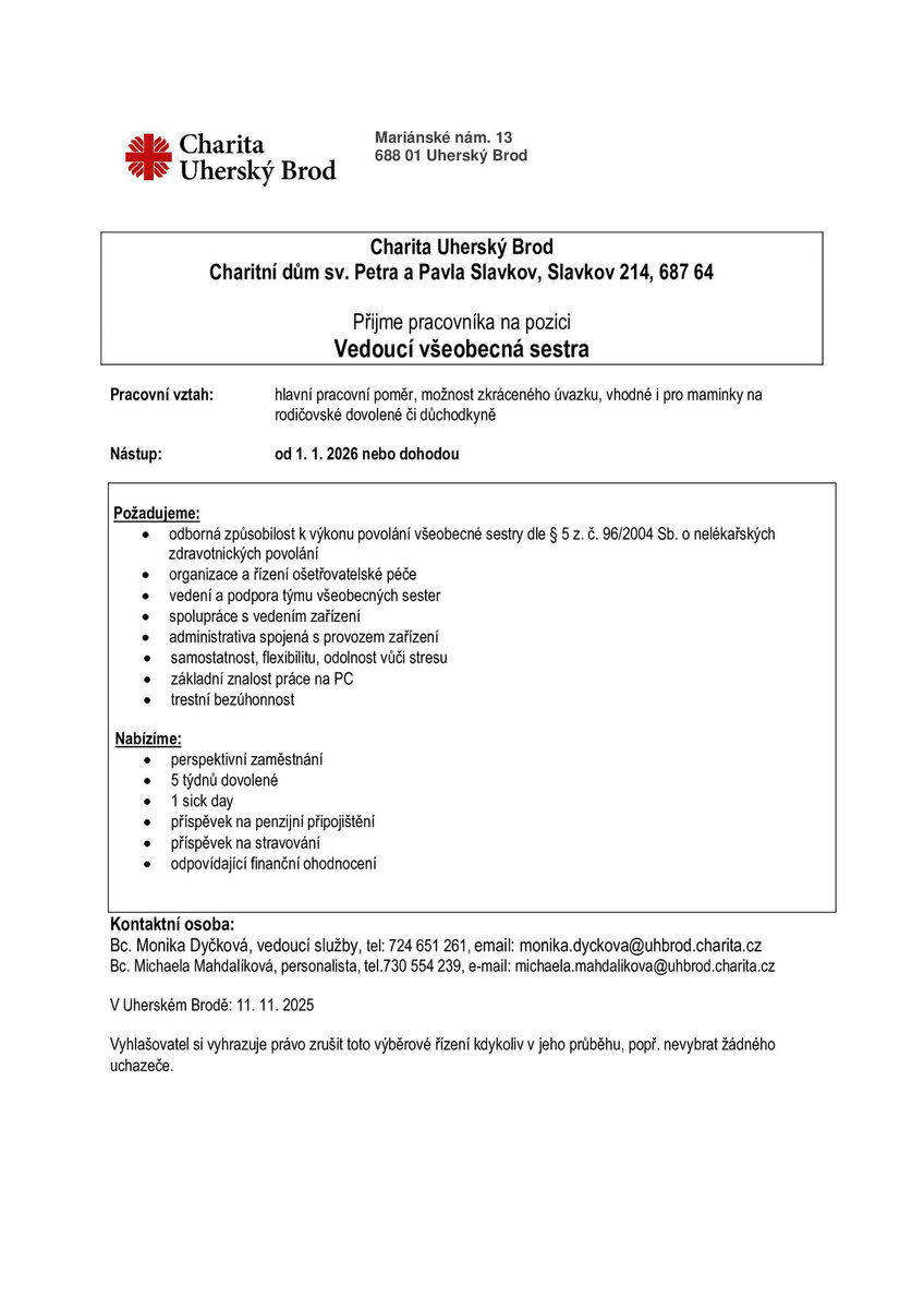Nabízíme volné pracovní místo na pozici Vedoucí všeobecná sestra pro Charitní dům Slavkov.