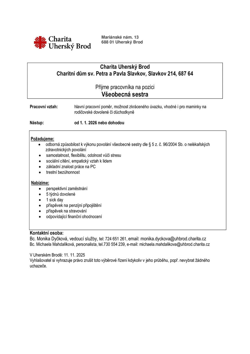 Charita Uherský Brod nabízí volné pracovní místo na pozici Všeobecná sestra pro Charitní dům Slavkov.