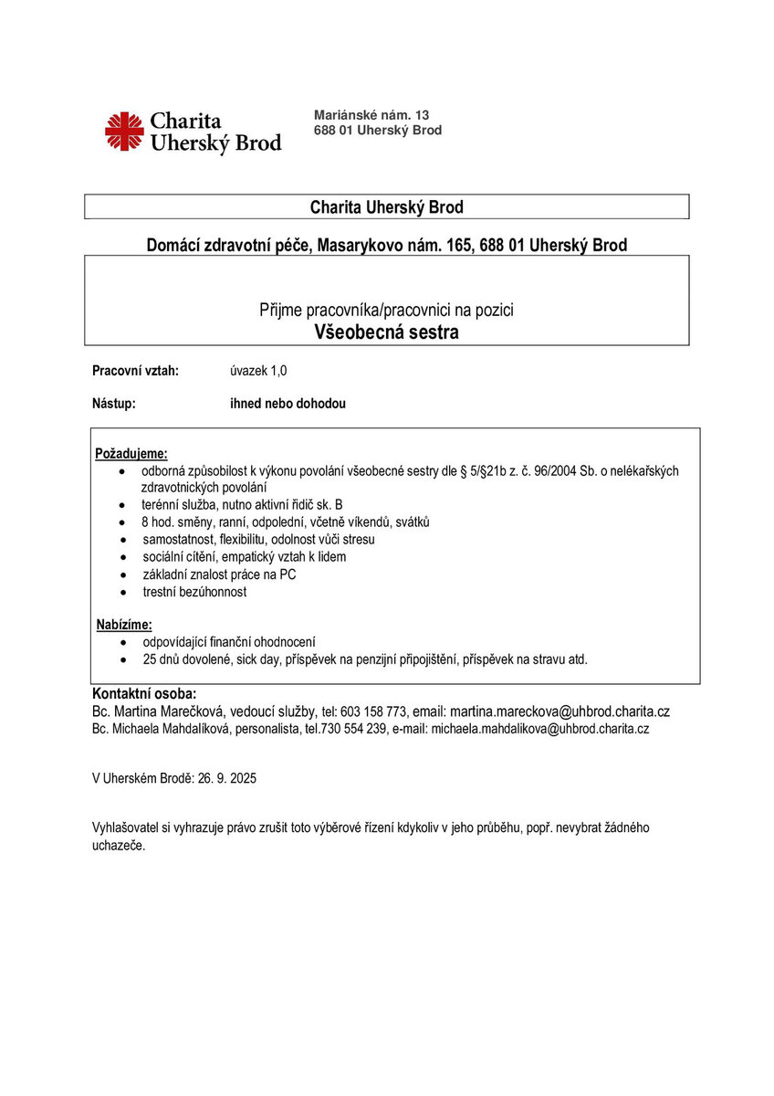 Charita Uherský Brod nabízí pracovní místo na pozici Všeobecná sestra pro Domácí zdravotní péči Uherský Brod.