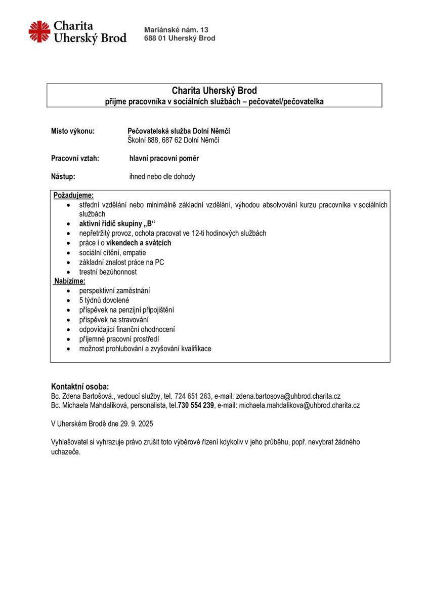 Charita Uherský Brod nabízí volné pracovní místo na pozici Pečovatel/pečovatelka pro Pečovatelskpou službu Dolní Němčí.