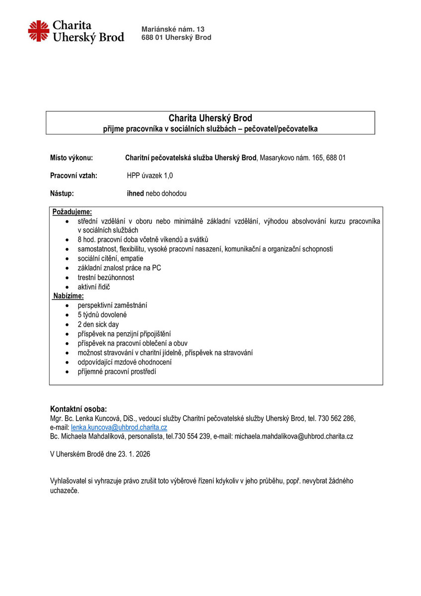 Charita Uherský Brod nabízí volné pracovní místo na pozici Pečovatel/pečovatelka pro Charitní pečovatelskou službu Uherský Brod.